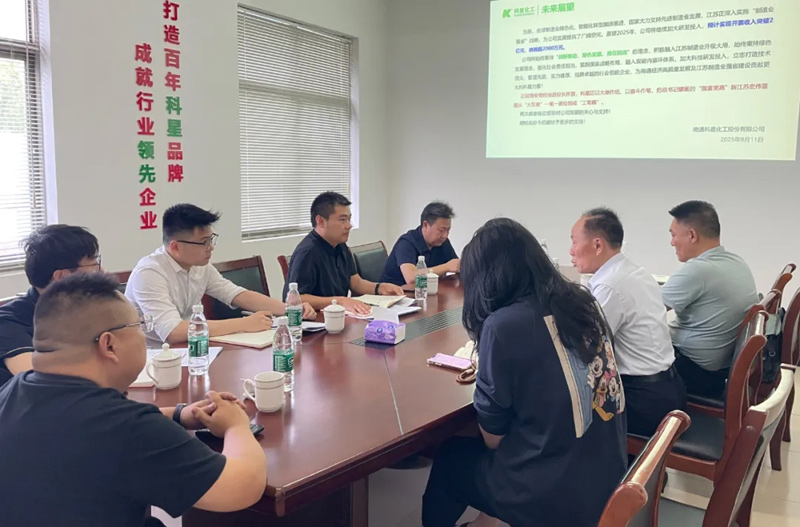 2025年9月11日下午,南通市發(fā)改委經(jīng)濟運行調(diào)節(jié)處處長王帥軍,四級主任科員俞榮、姬一峰,海安市發(fā)改委黨組副書記、副主任楊成龍,白甸鎮(zhèn)副鎮(zhèn)長郭勇及經(jīng)發(fā)辦相關(guān)負責人蒞臨南通科星化工股份有限公司開展走訪調(diào)研工作。此次調(diào)研旨在深入了解企業(yè)發(fā)展現(xiàn)狀,傾聽企業(yè)需求,為企業(yè)排憂解難,助力企業(yè)高質(zhì)量發(fā)展??菩嵌麻L吳龍鐵及副總經(jīng)理劉小燕在工廠行政樓會議室熱情接待了來訪領(lǐng)導,并進行了深入交流。